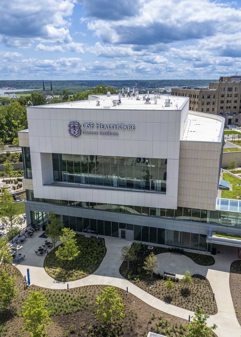 The OSF HealthCare Comprehensive Cancer Institute project, located in Peoria, IL, included the new construction of a six-story, 215,000-square-foot cancer treatment facility and parking structure.