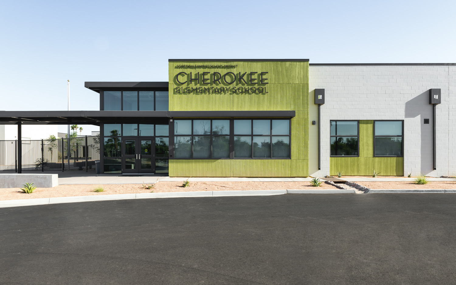 The Cherokee Elementary School Rebuild and Remodel project, built for Scottsdale Unified School District, included select demolition, renovation, and new additions to an elementary school in Paradise Valley, AZ. The project occurred in three phases. The first phase included the construction of two classroom buildings and the update of safety and security systems throughout the existing campus. This phase also included the construction of playground structures, walkways, outdoor learning spaces, and fields for soccer and baseball. The second phase included the partial demolition and complete reconstruction of the campus administrative and multi-purpose buildings. New construction during this phase included two gymnasiums, a kitchen with a stage, additional outdoor learning centers, and a state-of-the-art media center. The third phase included the demolition of the two northmost buildings, which were replaced by a parking lot, an extended cueing lane, and a drop-off zone. A unique feature of this project was incorporating an interactive school bus inside the library, based on the beloved Junie B. Jones novels, the first of which is titled “Stupid Smelly Bus.” The author of the series, Barbra Park, says she drew her inspiration for the character of Junie from her time at Cherokee Elementary School. Incorporating the bus within the library, later designated a Literary Landmark by the Arizona State Library, took excellent planning and coordination with the steel structure, building, and roofing all constructed around the bus. The school was built on a concrete foundation supported by footings with a concrete masonry unit, steel joint structural frame, an integral color concrete masonry unit, three-coat stucco exterior, and a thermoplastic polyolefin (TPO) roof.