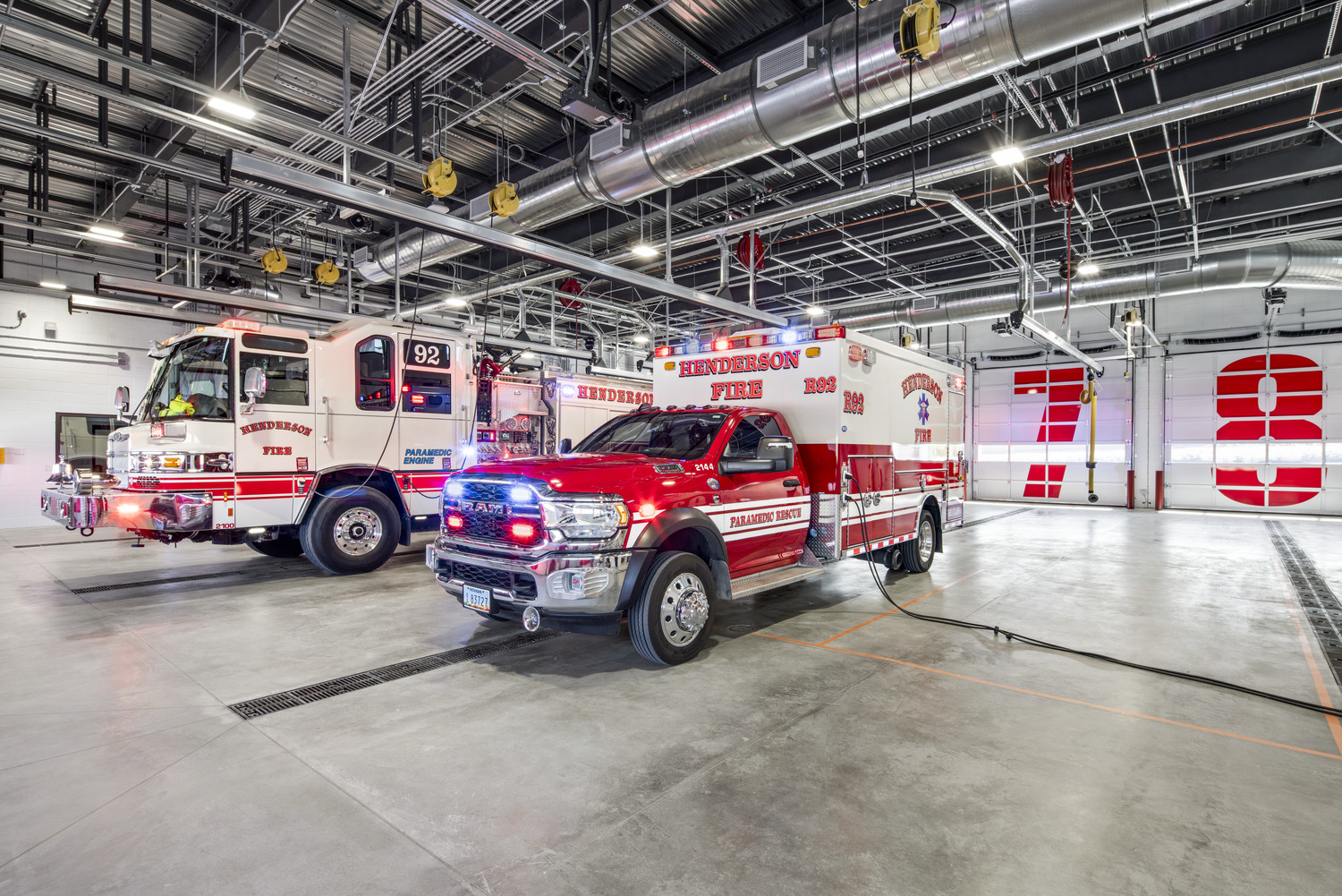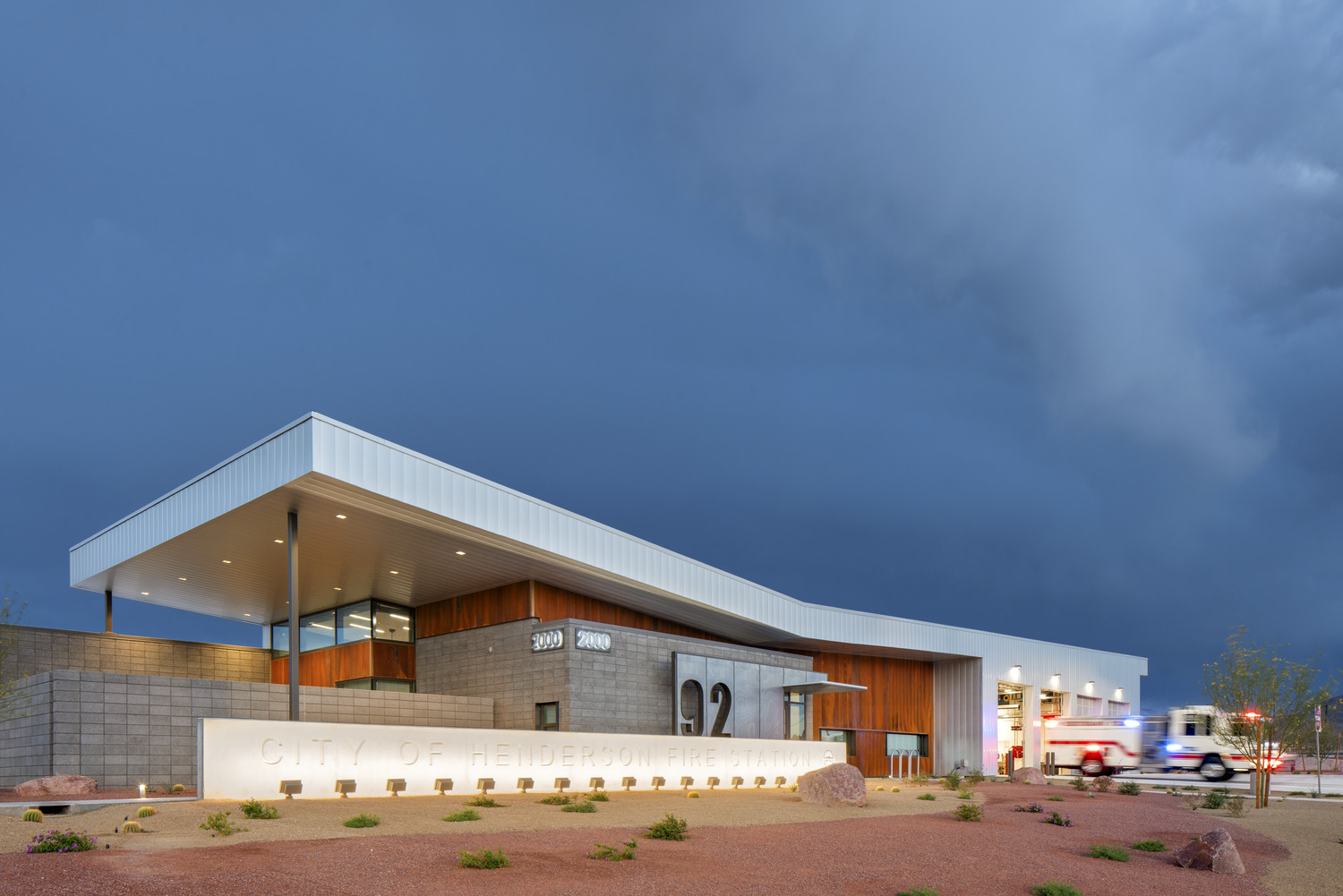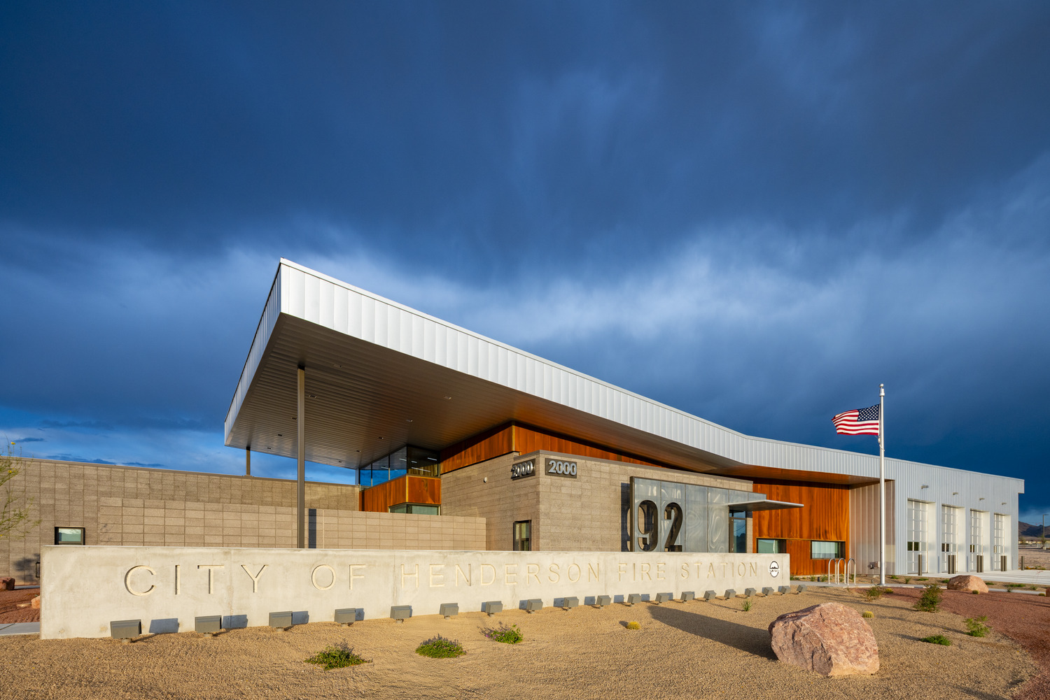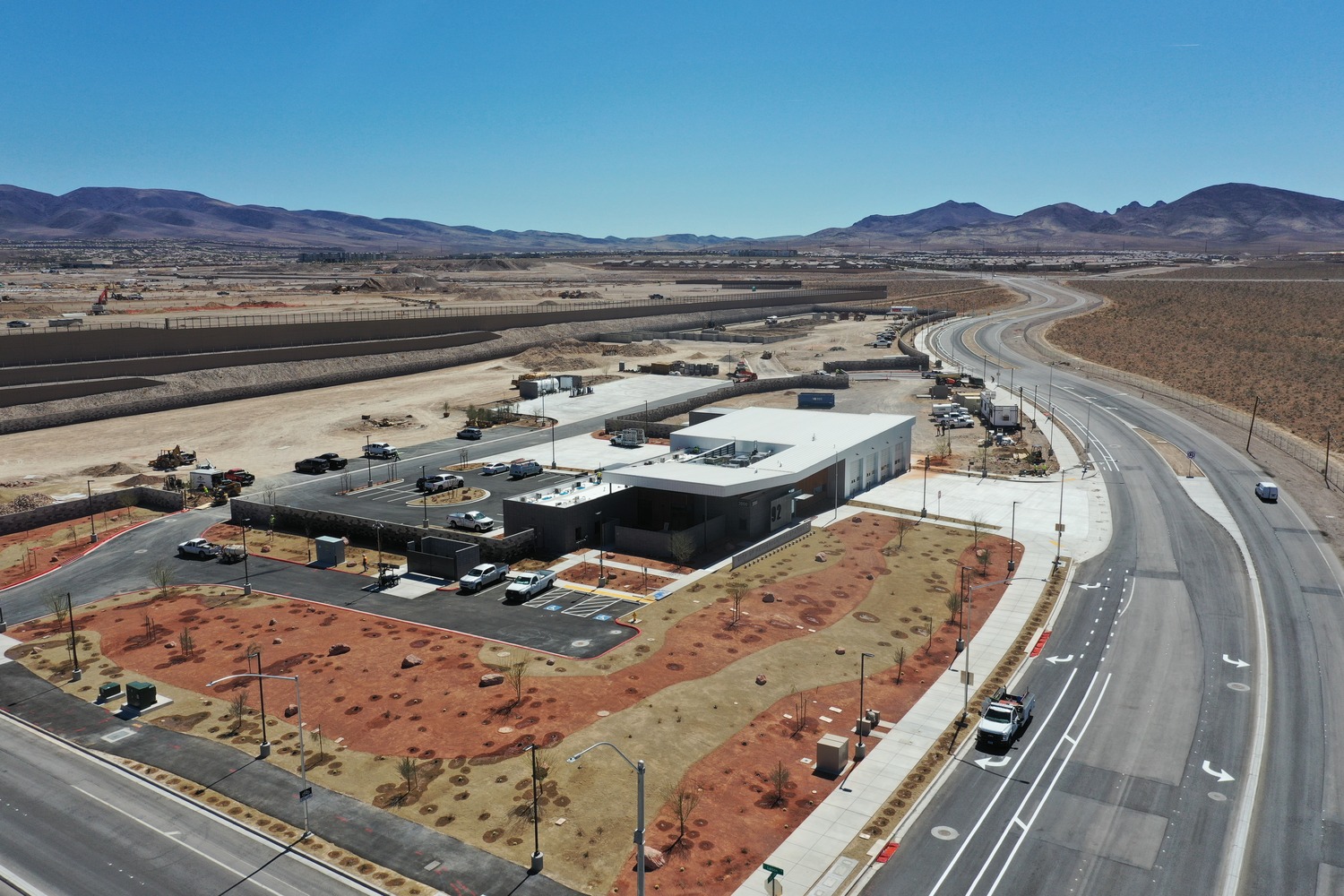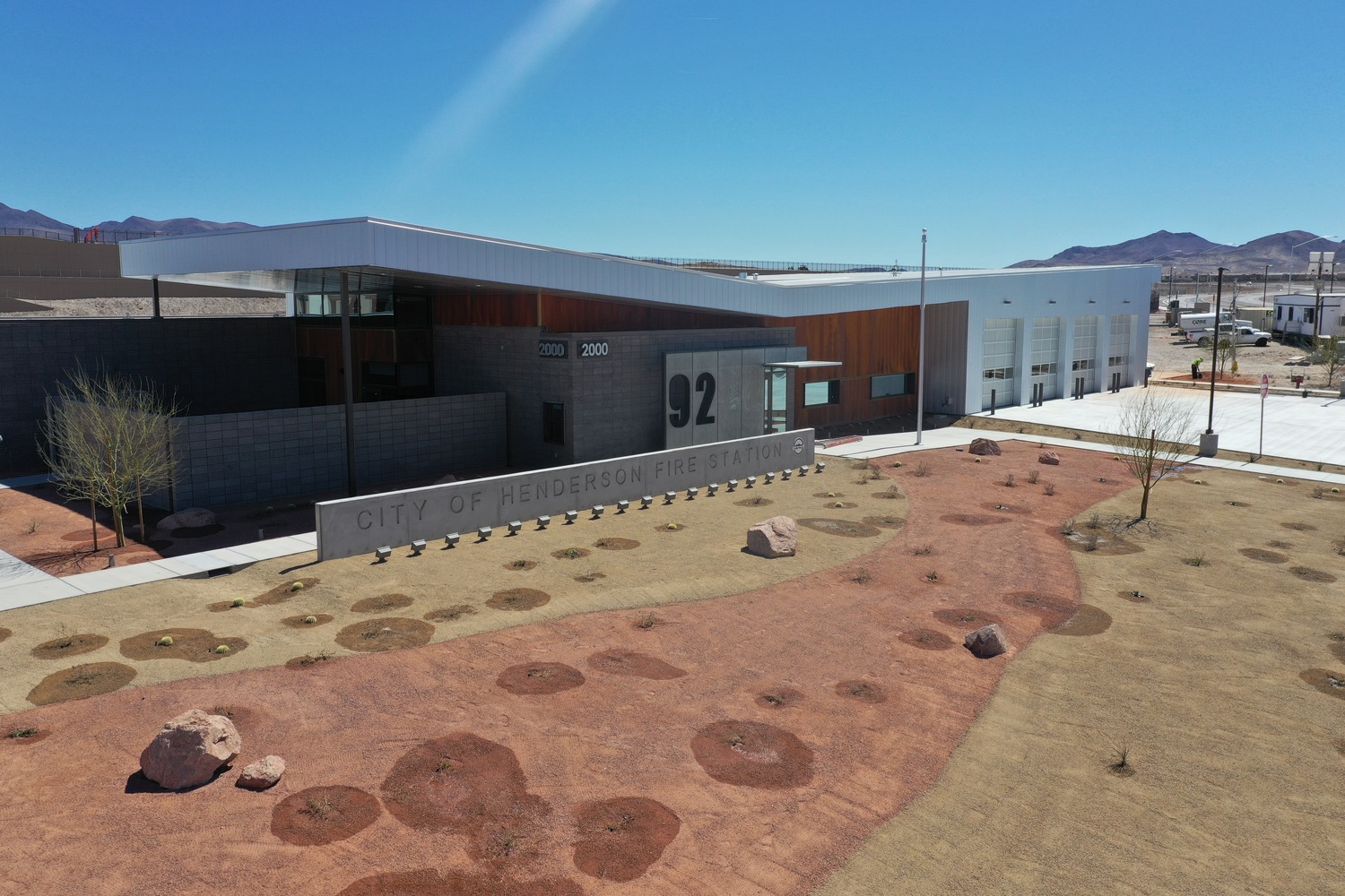 The Fire Station No. 92, built for the City of Henderson, has includes a 14,803-square-foot, single-story facility designed to support the City’s growing emergency response needs. Located in Henderson, NV, the four-bay station serves both as a fully operational firehouse and as an administrative hub. The project includes a 24-space parking lot, full utility infrastructure—power, water, sewer, and telecommunications—concrete flatwork, block walls, tube-steel fencing, site lighting, and landscaping, along with off-site improvements. A dedicated washdown area with cast-in-place concrete walls and a sump pit was also constructed to accommodate city sweeper trucks. The completed station enhances public safety capabilities while reflecting the City’s commitment to well-planned municipal infrastructure.