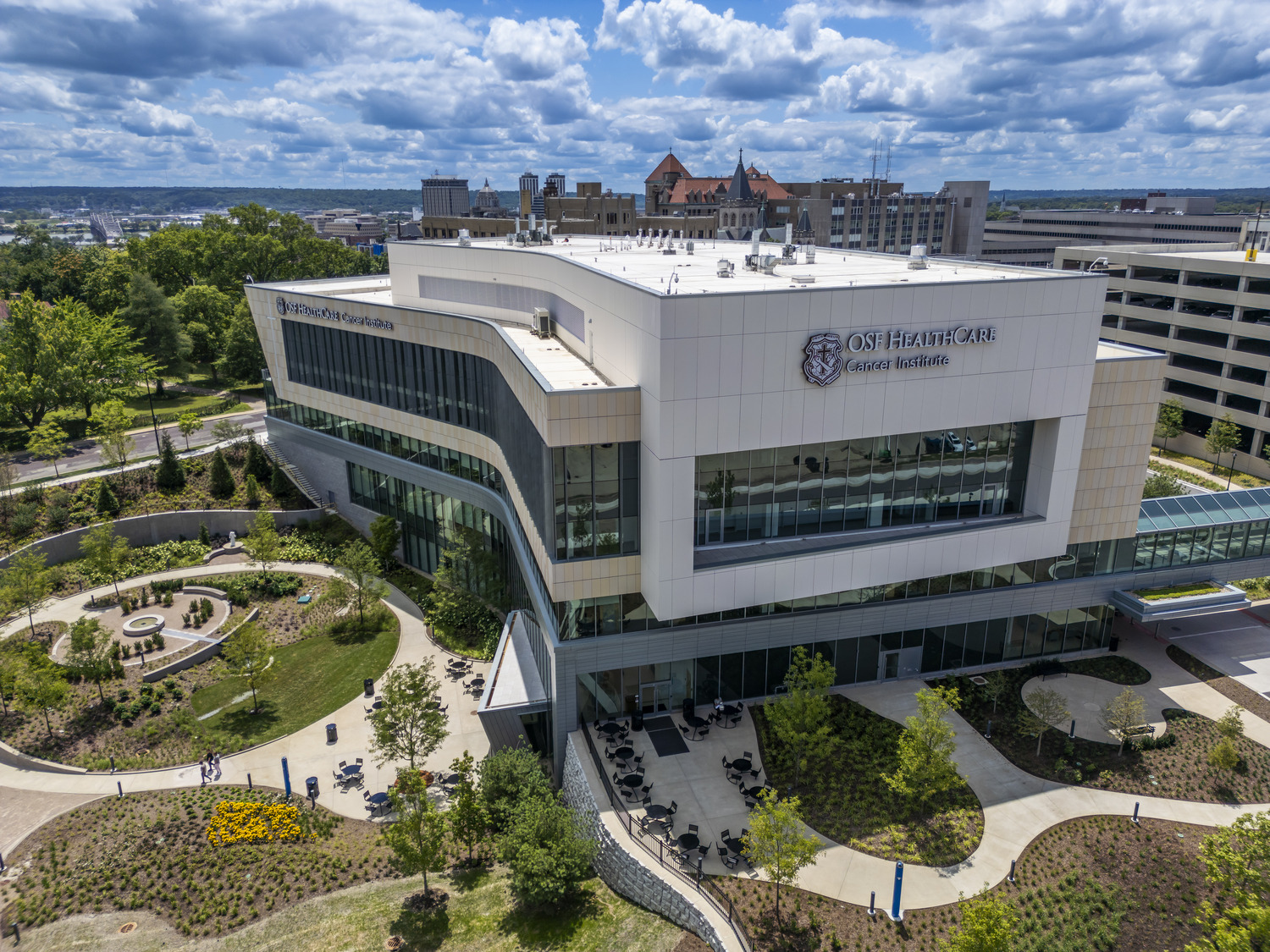 The OSF HealthCare Comprehensive Cancer Institute project, located in Peoria, IL, included the new construction of a six-story, 215,000-square-foot cancer treatment facility and parking structure. The Institute features advanced medical technology, including a concrete vault housing a Varian ProBeam Proton Therapy System with a Superconducting Cyclotron particle accelerator, beam transport system, 360-degree rotating gantry, and a custom-designed patient treatment room. In addition to state-of-the-art proton therapy, the facility includes dedicated areas for patient examination, consultation, and administrative functions, offering a holistic and centralized approach to cancer care. CORE served as a trusted partner in delivering this technically complex and mission-critical facility with precision, care, and a deep commitment to supporting OSF HealthCare’s vision for cutting-edge treatment.